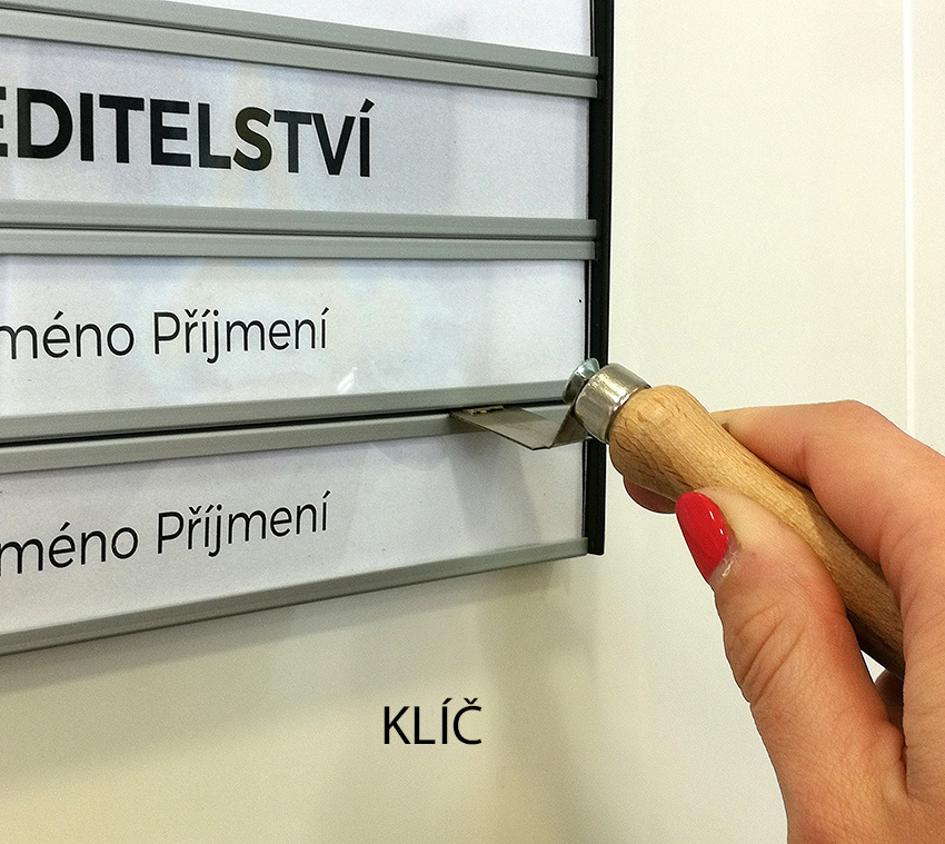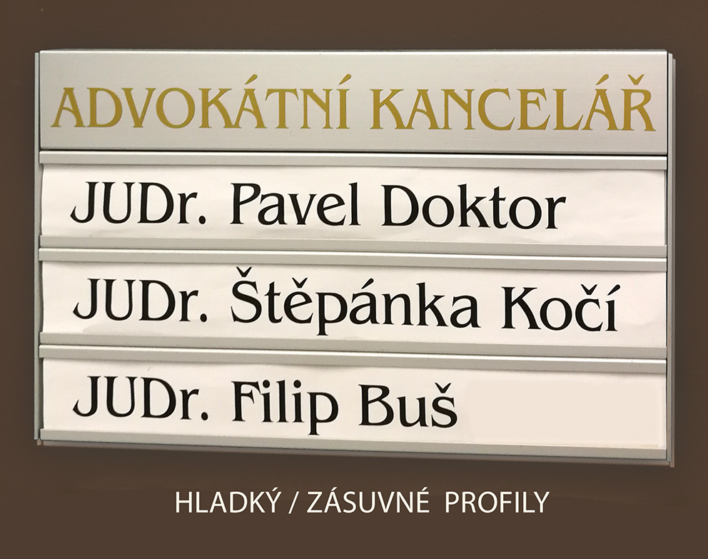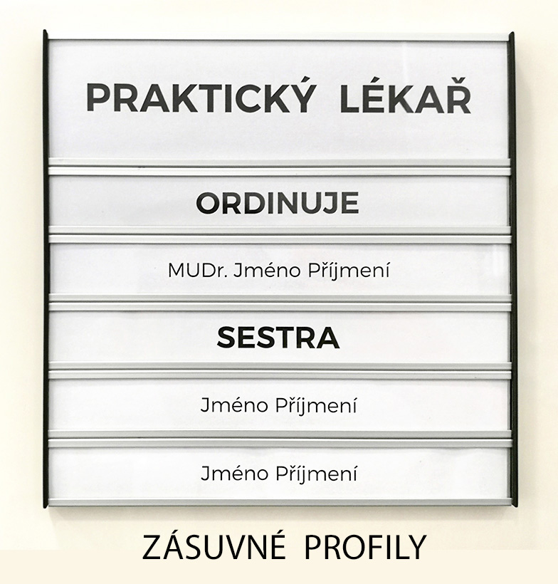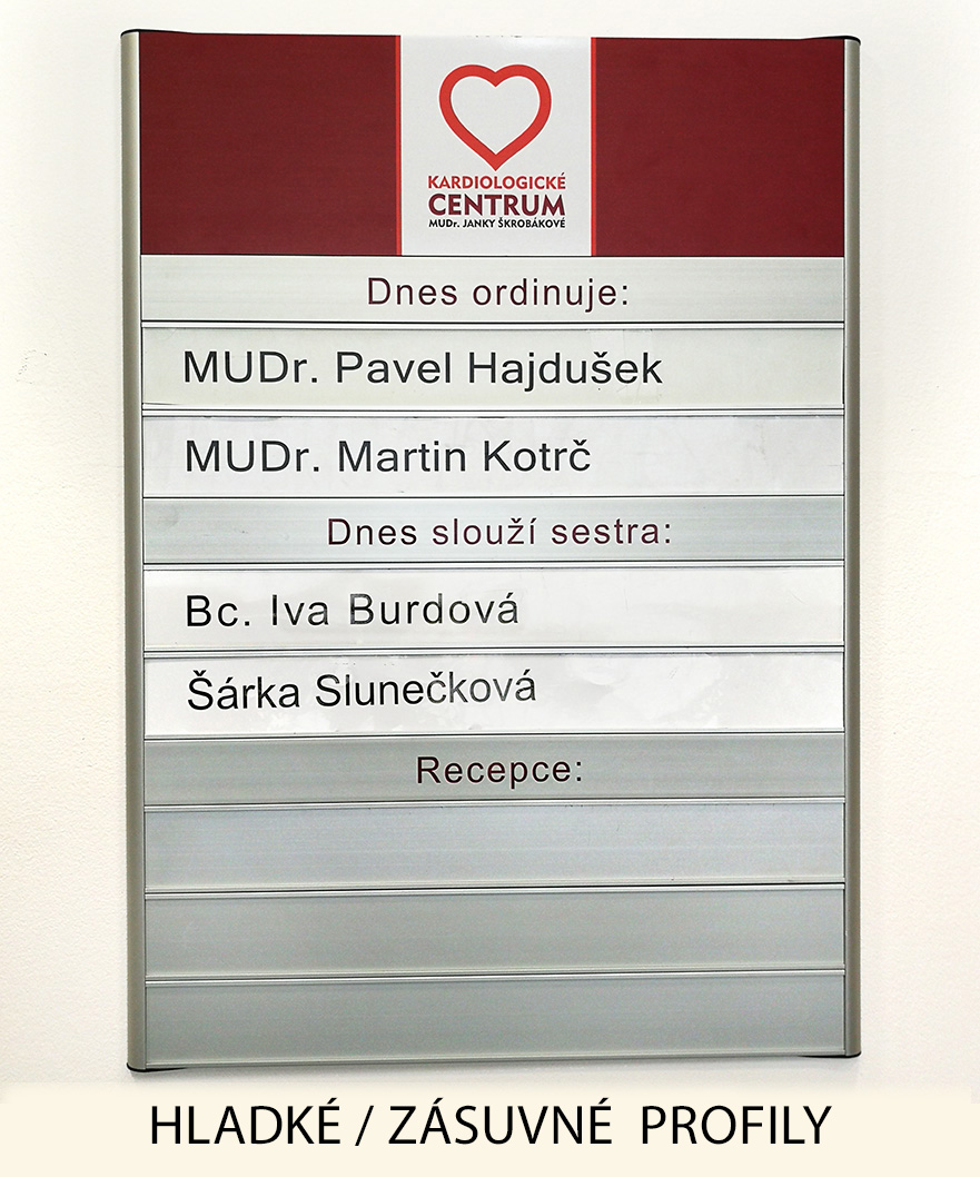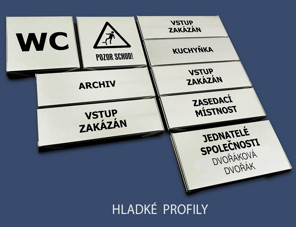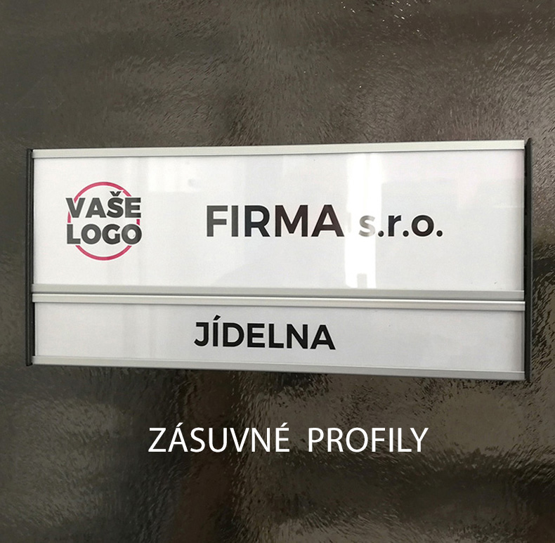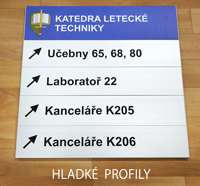 Na zakázku vyrábíme orientační cedule z profilů Triline belgického výrobce ACS. Tento systém je založen na principu modulárních hliníkových profilů o výšce 31 mm a jejich násobků (62, 93, 124, atd.), přičemž šířka je téměř neomezená. Hliníkové profily jsou buď hladké (určené pro polep) nebo zásuvné, ve kterých si sami snadno vyměníte jméno zasunutím jiného proužku papíru. K zásuvným modulům je možné přiobjednat krycí čirou fólii, která není v ceně.
